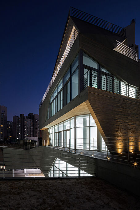 However, the condition of the site, located in Mapo, one of the old sections in Seoul, makes hard to design a building to be distinguished in urban scenery. Regarding physical environment of the site, the significantly irregular shaped site locates behind buildings consisted of ordinary neighborhood living facilities. Briefly, the site is hardly visible in surroundings, especially from main streets of City. In addition, due to the legal limitations, the building can be put in only small part of the site, and ground level has to be planned for parking lots. Hence, it was essential for us how to make the building have a standout image within these restrictions.